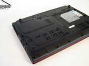 Nicht vollends überzeugen kann das Gaming Notebook allerdings in Hinsicht Gehäusestabilität. Die Baseunit gibt sich nur wenig verwindungssteif und lässt sich auch unter Druckbelastung teils doch sehr stark verformen. Dies ist insbesondere im mittleren Bereich der Zusatztasten der Fall. Beim Anheben des Gerätes an der Vorderkante kommt es auch zu leisen Quietsch- und Knarrgeräuschen, die eine beobachtbare Verformung begleiten.