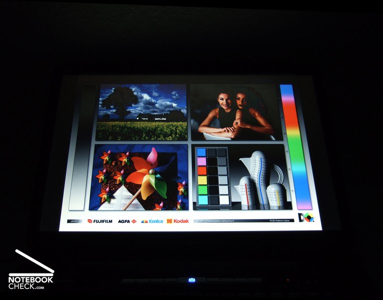 Bei unseren Betrachtungstests ergibt sich für das verbaute Panel ein durchschnittliches Bild. Positiv fallen uns neben der matten Displayoberfläche sofort die guten Blickwinkeleigenschaften des Panels auf. Insbesondere in der Horizontale sind überdurchschnittlich weite Einblickwinkel möglich, in der Vertikalen nimmt die Qualität wie erwartet etwas schneller ab, bleibt aber dennoch im guten Bereich. Farben stellt das LCD leicht gedämpft, dafür aber recht farbneutral dar. Die Kontraste wirken ebenfalls etwas mau.
