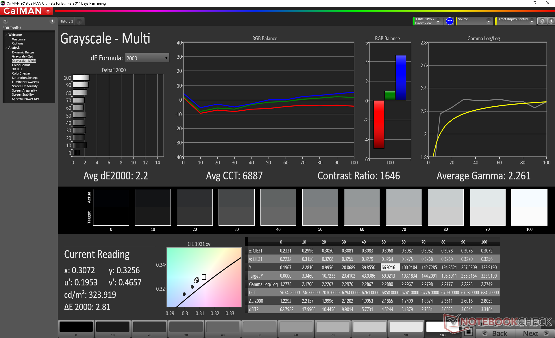 | Delta E Graustufen * | 2.2 | 4.79 -118% | 5.4 -145% | 4.6 -109% | 2.8 -27% | 0.9 59% |