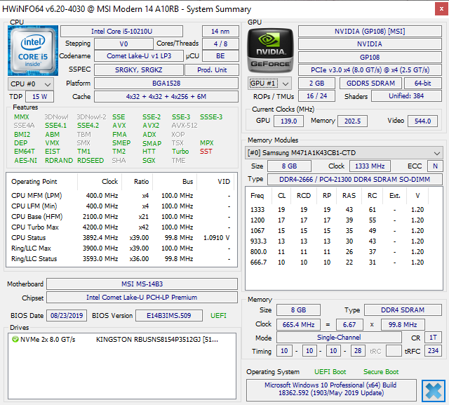 | MSI Modern 14 A10RB-459US i5-10210U, GeForce MX250, Kingston RBUSNS8154P3512GJ, IPS, 1920x1080, 14" | Asus ZenBook 15 UX534FT-DB77 i7-8565U, GeForce GTX 1650 Max-Q, Samsung SSD PM981 MZVLB1T0HALR, IPS, 1920x1080, 15.6" | Lenovo Yoga C940-14IIL i7-1065G7, Iris Plus Graphics G7 (Ice Lake 64 EU), Samsung SSD PM981 MZVLB512HAJQ, IPS LED, 1920x1080, 14" | Dell XPS 15 7590 9980HK GTX 1650 i9-9980HK, GeForce GTX 1650 Mobile, Toshiba XG6 KXG60ZNV1T02, OLED, 3840x2160, 15.6" | Apple MacBook Pro 16 2019 i9 5500M i9-9880H, Radeon Pro 5500M, Apple SSD AP1024 7171, IPS, 3072x1920, 16" | Lenovo ThinkPad X1 Carbon 2019-20QE000VGE i7-8665U, UHD Graphics 620, WDC PC SN720 SDAQNTW-512G, IPS, 2560x1440, 14" | |