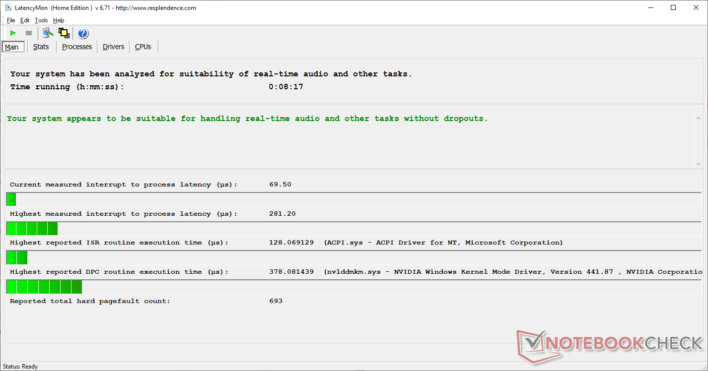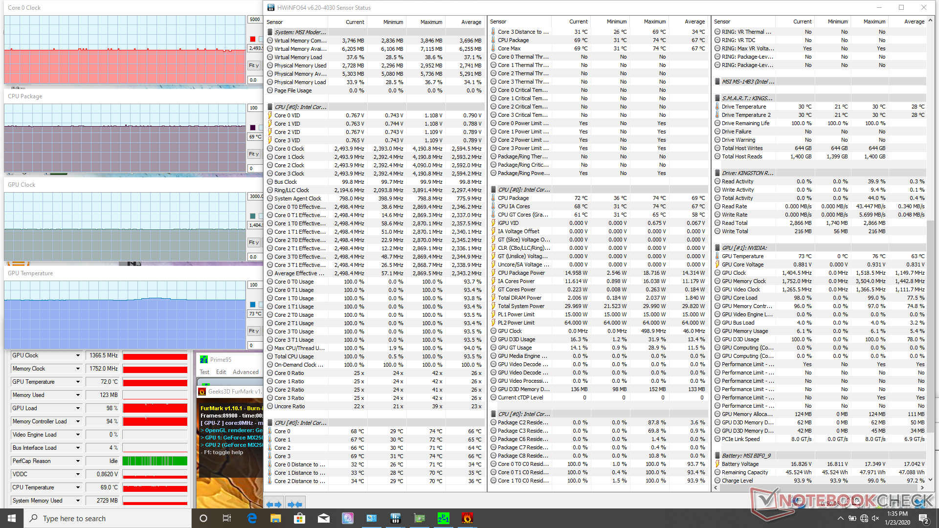 Um ihn auf potenzielles Drosseln und mögliche Stabilitätsprobleme zu testen, lasten wir den Laptop künstlich aus. Beim Ausführen von Prime95 steigt die CPU-Taktfrequenz für die ersten 40 Sekunden auf den 2,7-bis-3-GHz-Bereich, worauf der Prozessor eine Kerntemperatur von 70 °C erreicht. Im Anschluss fällt die Taktfrequenz auf den 2,3-bis-2,5-GHz-Bereich, um eine Kerntemperatur von 71 °C aufrechterhalten zu können. Diese Ergebnisse decken sich mit unseren Beobachtungen im obigen Cinebench-R15-Multi-Thread-Schleifentest und den Messungen zur Energieaufnahme unten.