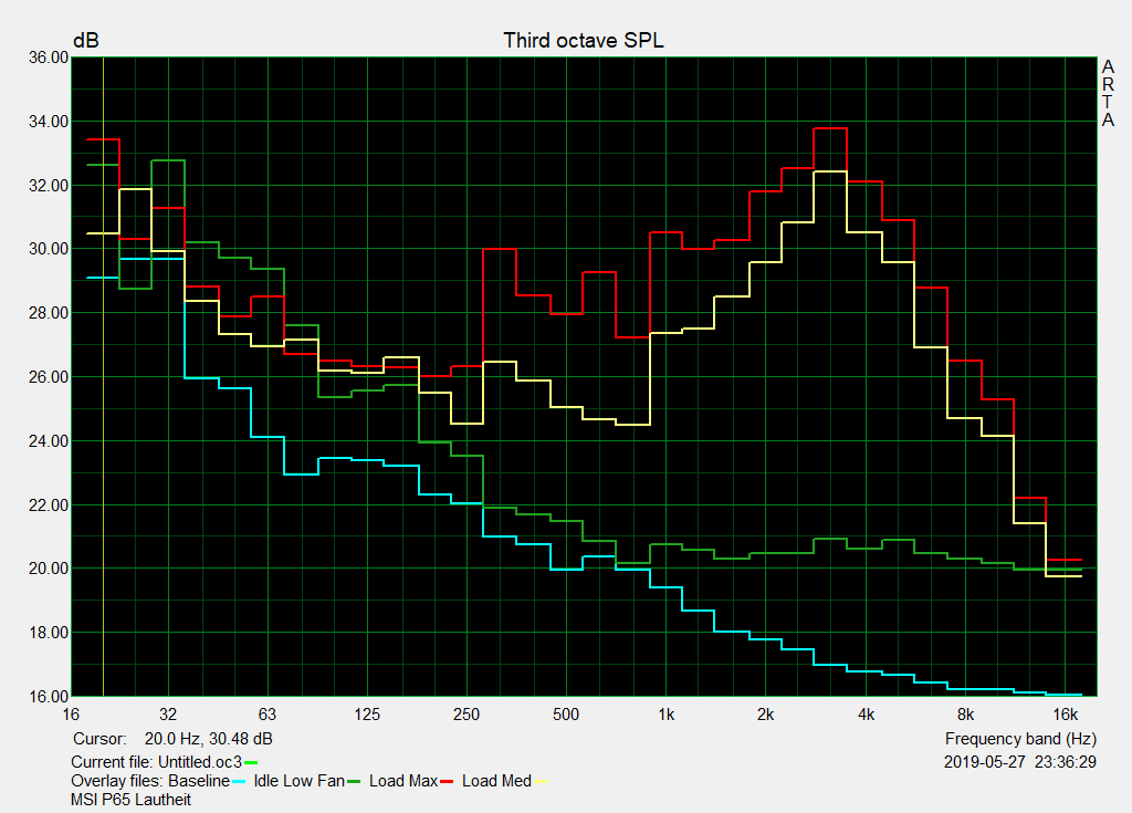 Das MSI P65 Creator 9SF ist im Officebetrieb sehr leise und damit auch für den Einsatz in ruhigeren Umgebungen geeignet. Die Lüfter laufen dabei zwar durchgängig, sind aber so gut wie nicht zu hören. Werden grafisch anspruchsvolle Anwendungen ausgeführt, drehen die drei Lüfter aber schnell auf und sind deutlich zu hören. Das Lüftergeräusch ist dabei sehr gleichmäßig rauschend und wird nur von einem leisen, hochfrequenten Ton begleitet.