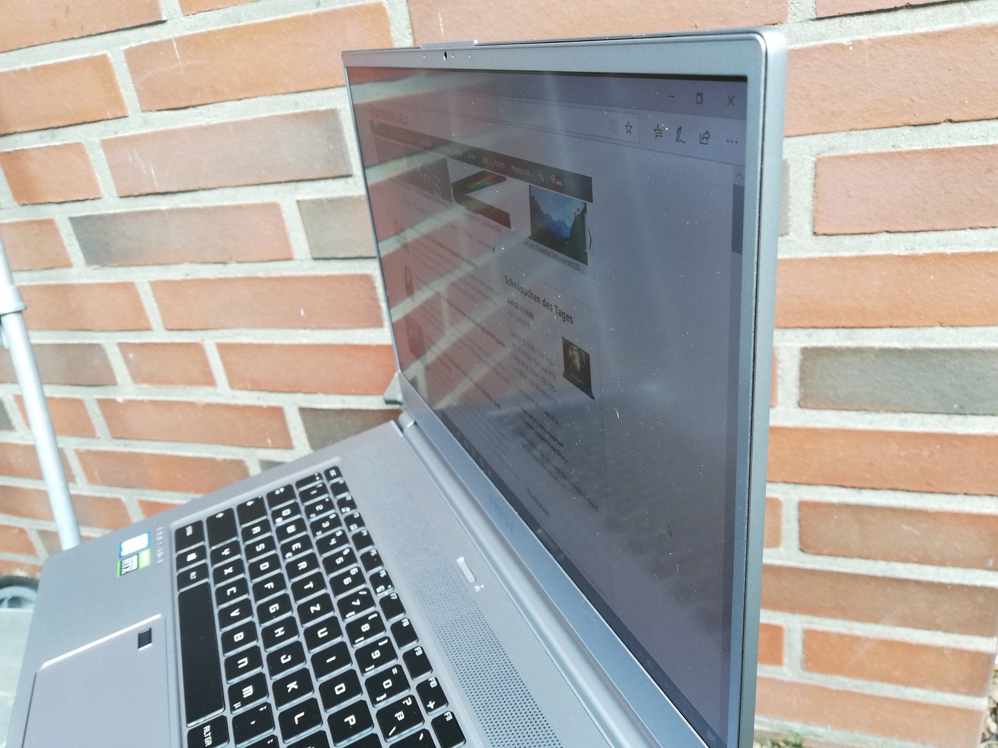 Das MSI P65 Creator lässt sich im Freien gut verwenden. Die Helligkeit reicht dabei aus, um Bildinhalte auch an helleren Tagen gut ablesen zu können. Das semi-matte Display neigt allerdings zu leichten Spiegelungen von Objekten in der Umgebung, die sich aber hauptsächlich bei schrägen Blickwinkeln einstellen.