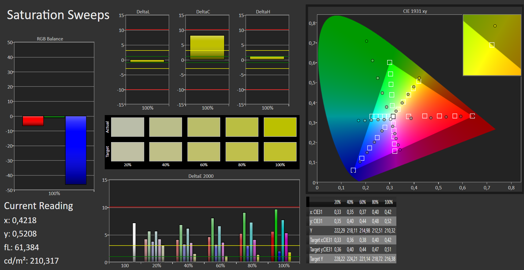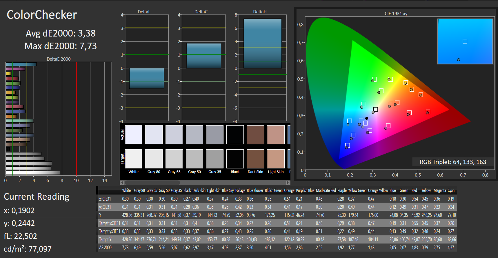| Colorchecker dE 2000 max. * | 7.79 | 4.89 37% | 4.4 44% | 8.33 -7% | 2.47 68% |