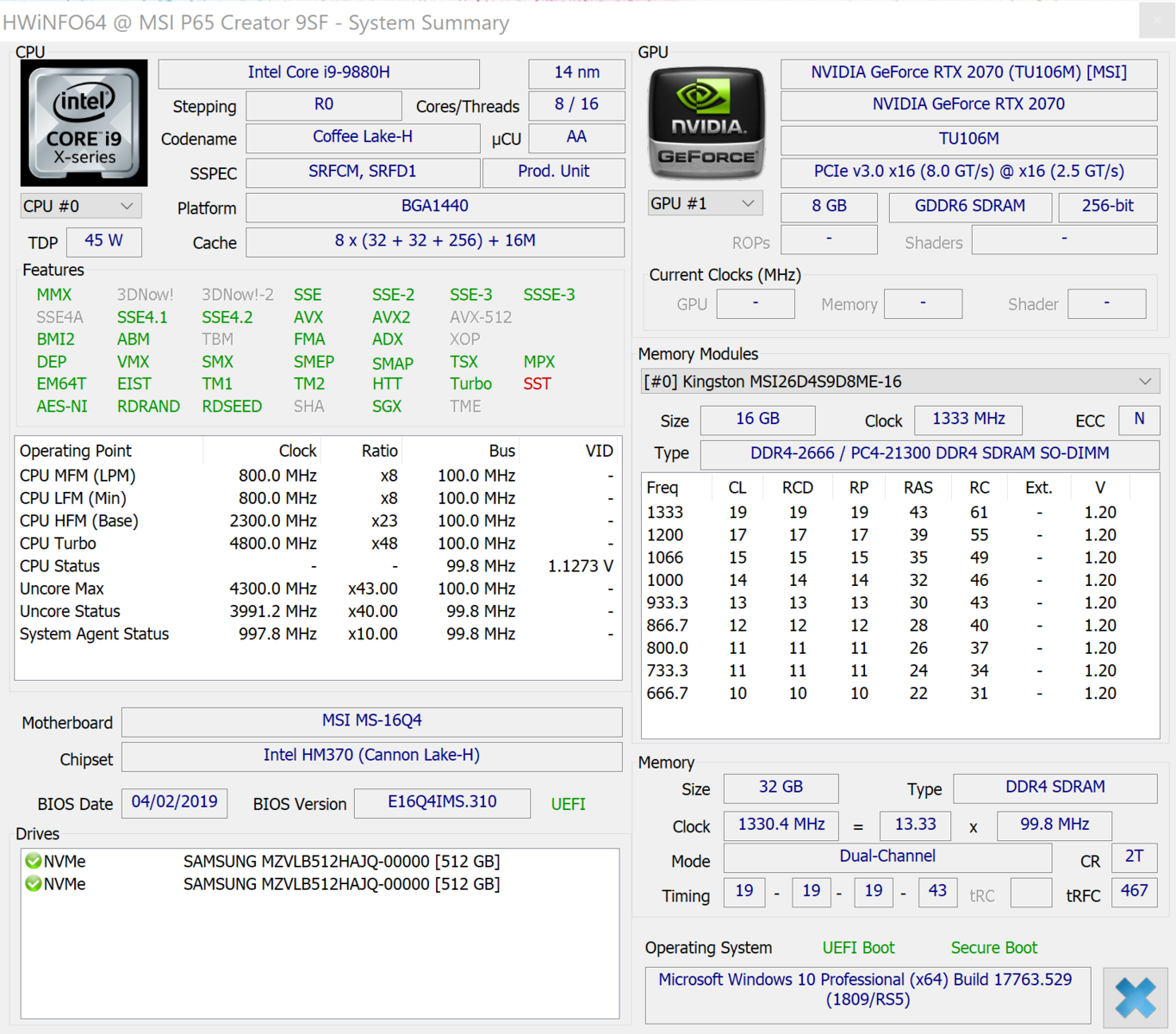 Test MSI P65 Creator 9SF (i9-9880H, RTX2070 Max-Q) Laptop