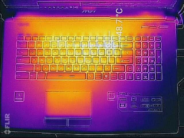 Da die internen Bauteile eine sehr große Ähnlichkeit zum PE60 aufweisen, sind auch die Temperaturen wenig überraschend sehr ähnlich. Das Touchpad wird wärmer als bei den meisten anderen Notebooks und auf der Unterseite liegt der Hotspot im Bereich der Heatpipes sowie der zweiten Festplatte. Der Großteil der Unterseite ist jedoch recht kühl, denn die Heatpipes haben keinen direkten Kontakt zur Oberfläche und dank der großen Anzahl an Lüftungsgittern kann die Luft besser zirkulieren. Der Nachteil ist natürlich das dickere Gehäuse. Maximal konnten wir an einem einzigen Punkt auf der Rückseite bis zu 54 °C messen.