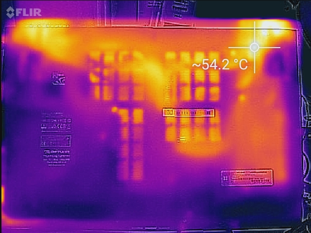 (-) Auf der Unterseite messen wir eine maximalen Wert von 54 °C (im Vergleich zum Durchschnitt von 39.2 °C).