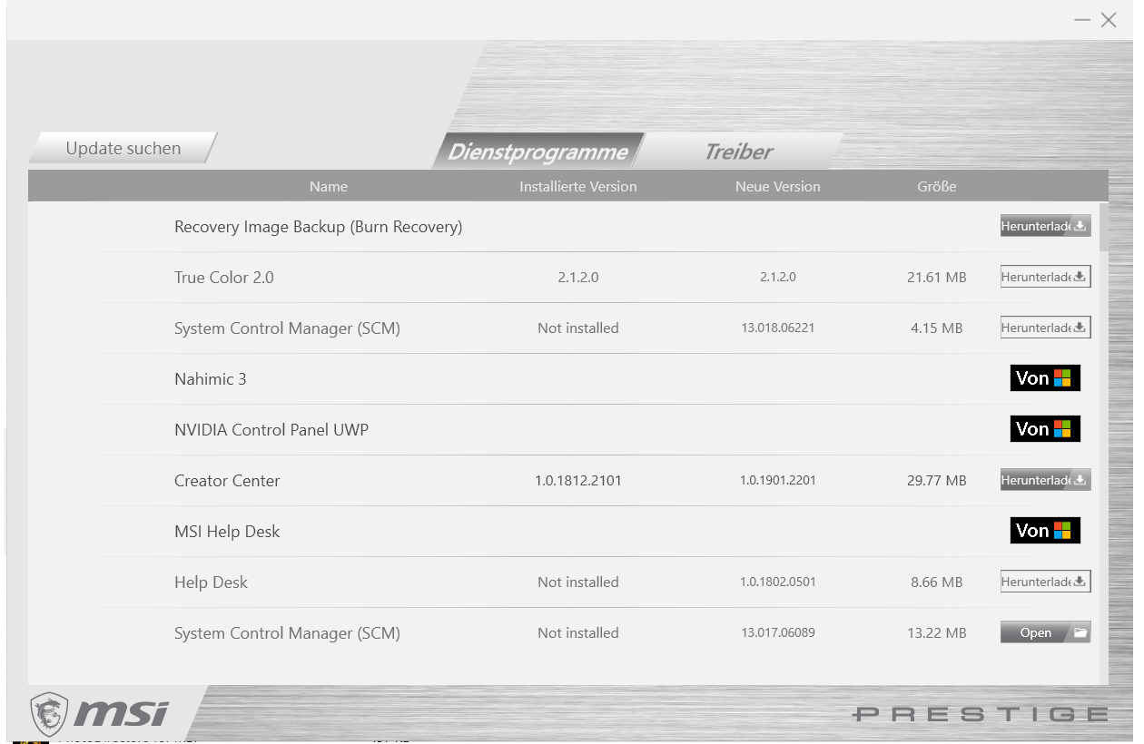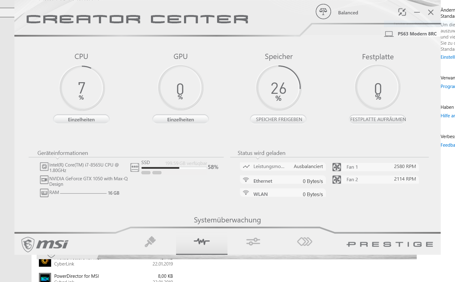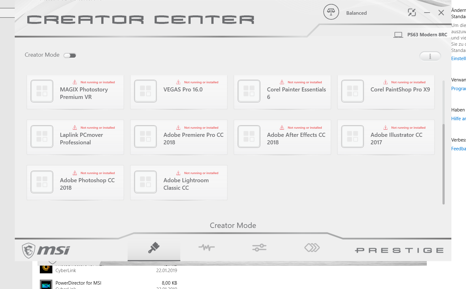 MSI spielt das CreatorCenter und das ControlCenter auf. Letzteres kümmert sich um Treiber und um die Aktualität von systemrelevanter Software, wie Nvidia Control Panel. Das CreatorCenter verbindet die Hardware mit der Software. Sie können etwa leistungshungrige Video-Tools wie VEGAS Pro 16 mit bestimmten Farb- und Leistungsprofilen verknüpfen.