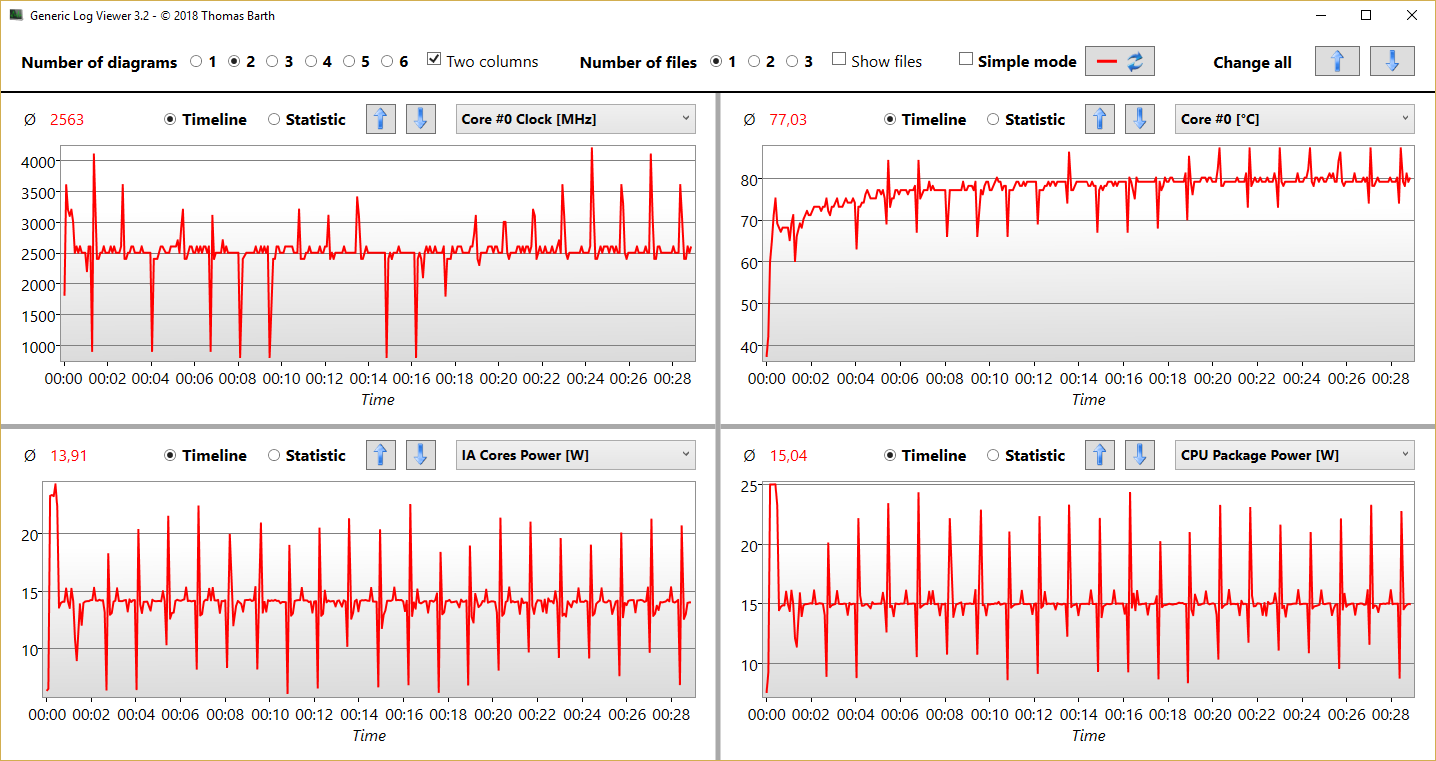 Während die Grafikkarte dauerhaft mit fast unverminderter Kraft rechnen kann, arbeitet der Prozessor nur knapp oberhalb seines Basistaktes von 1,8 GHz. Wohl gemerkt, wir sprechen nicht von Throttling (Unterschreiten des Basistaktes) und in der R15-Dauerschleife lag der Takt bei ca. 2,5 GHz, also im Turbo-Bereich.