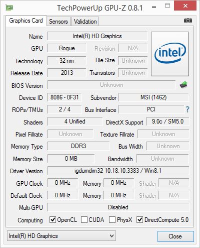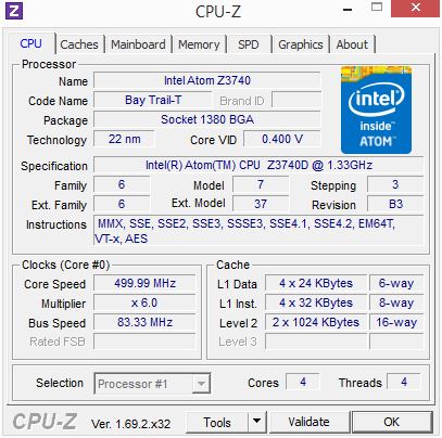Der Intel-Atom-Z3740D-Quad-Core-Prozessor ist einer von vielen Modellen in der Baytrail-T-Prozessorfamilie. Die Unterschiede zwischen den einzelnen Modellen sind nicht besonders groß, aber der Z3740D repräsentiert die mittlere Leistungsvariante. Er unterstützt zahlreiche Funktionen wie InstantGo, Intel Quick Sync oder auch WiDi. Wie wir bereits erwähnt haben, läuft unser Modell maximal mit 1,33 GHz und damit ohne Turbo Boost. Wir gehen nicht davon aus, dass MSI das beabsichtigt hat, allerdings steht auch in den Marketing-Unterlagen lediglich 1,33 GHz. Es gibt keinen offensichtlichen Grund, den Turbo Boost bei diesem relativ großen Windows Tablet zu deaktivieren.