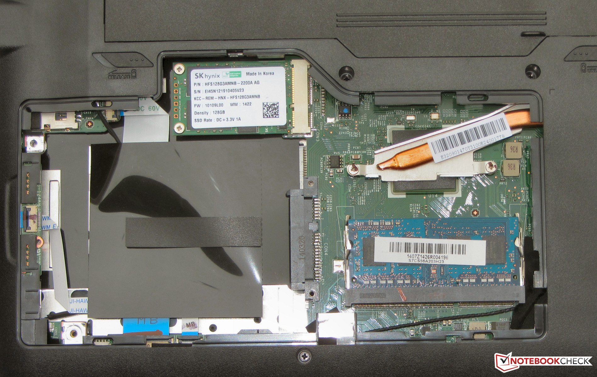 Das kleine Notebook kommt mit einem schwarzen Kunststoffgehäuse; lediglich die Deckelrückseite besteht aus gebürstetem Aluminium. Auf der Oberseite der Baseunit wird gebürstetes Aluminium simuliert. Die Zwischenräume der Tastatur bestehen aus glänzendem Kunststoff. Das Gerät zeigt sich insgesamt ordentlich gefertigt, allerdings kann die Baseunit zu leicht verdreht werden. Der Rechner ist löblicherweise mit einer Wartungsklappe ausgestattet, folglich stellt ein Zugriff auf den Arbeitsspeicher und die Solid State Disk kein Problem dar. Das Notebook verfügt zudem über einen freien Festplattensteckplatz. Somit könnte das Gerät um eine 2,5-Zoll-Festplatte erweitert werden. Der benötige Einbaurahmen liegt dem Rechner bei.