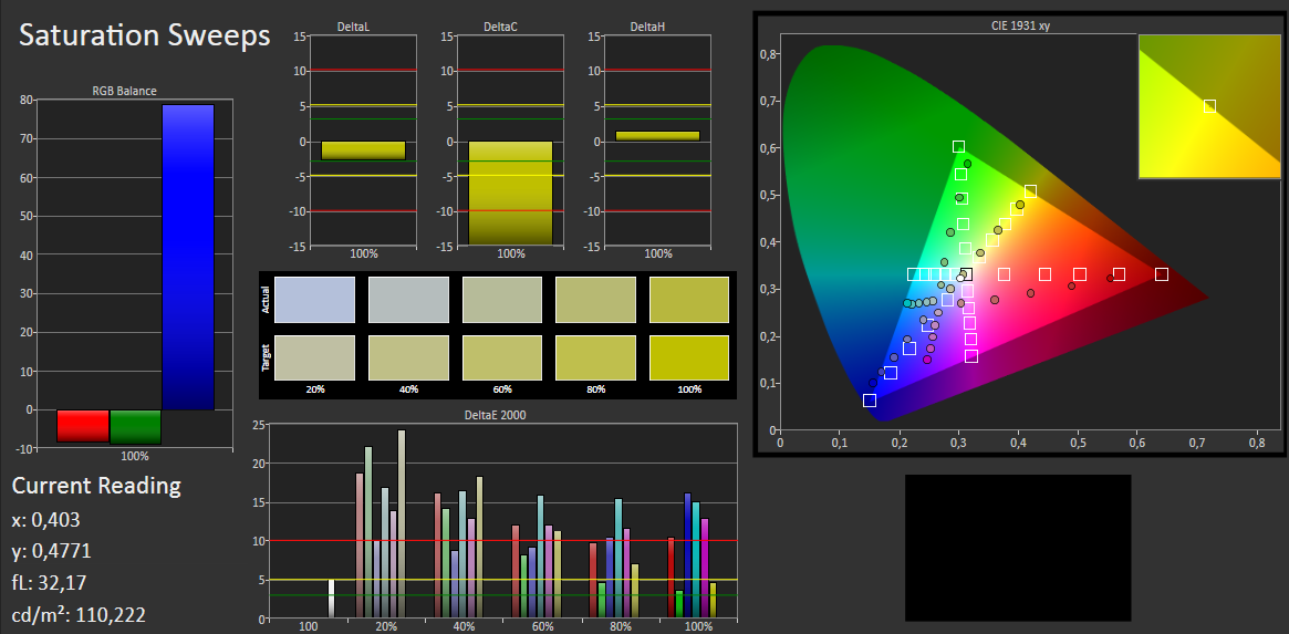 Wie für Displays in dieser Preisklasse üblich, kann der Farbraum im Vergleich zum sRGB Referenzfarbraum nicht ausgefüllt werden. Deutlich zeigt sich eine Verschiebung ins Blaue. Für professionelle Bildbearbeitung reicht die Farbegenauigkeit nicht aus. Für den normalen Benutzer mit Büroanwendungen, Videos und Spielen ist die Farbwiedergabe jedoch ausreichend.
