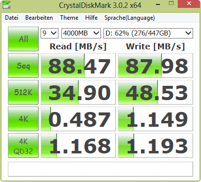 Die WD5000LPVT läuft mit 5400 Umdrehungen in der Minute und hat mit 17,3 Millisekunden gute Lesezugriffszeiten und mit 87,3 Megabyte je Sekunde gute Datenraten. Interessanterweise kommen bei der Konkurrenz keine besseren HDDs zum Einsatz. Somit kann unser Testgerät im Bereich Massenspeicher durchaus punkten.