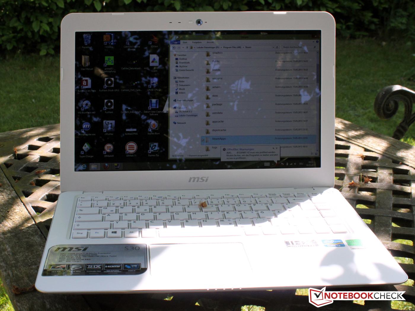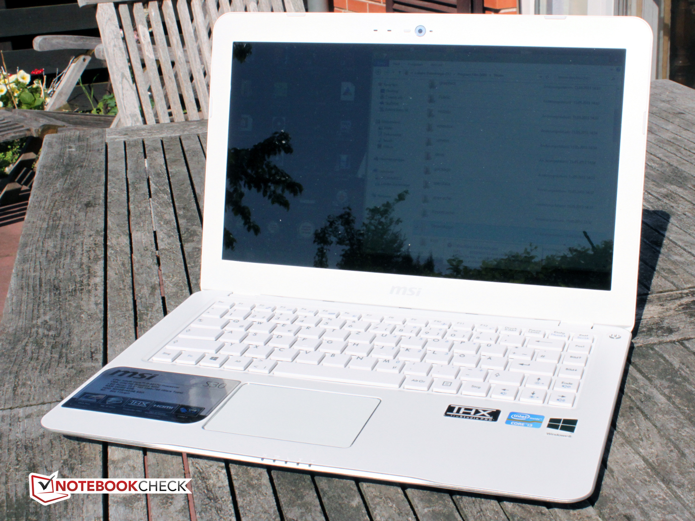 Durch die geringe Helligkeit im Akkubetrieb von lediglich 136 cd/m² und das spiegelnde Display ist das Subnotebook von MSI für den Außeneinsatz so gut wie ungeeignet. Lediglich im tiefen Schatten und mit möglichst dunklem Hintergrund kann der Bildschirminhalt klar erkannt werden.