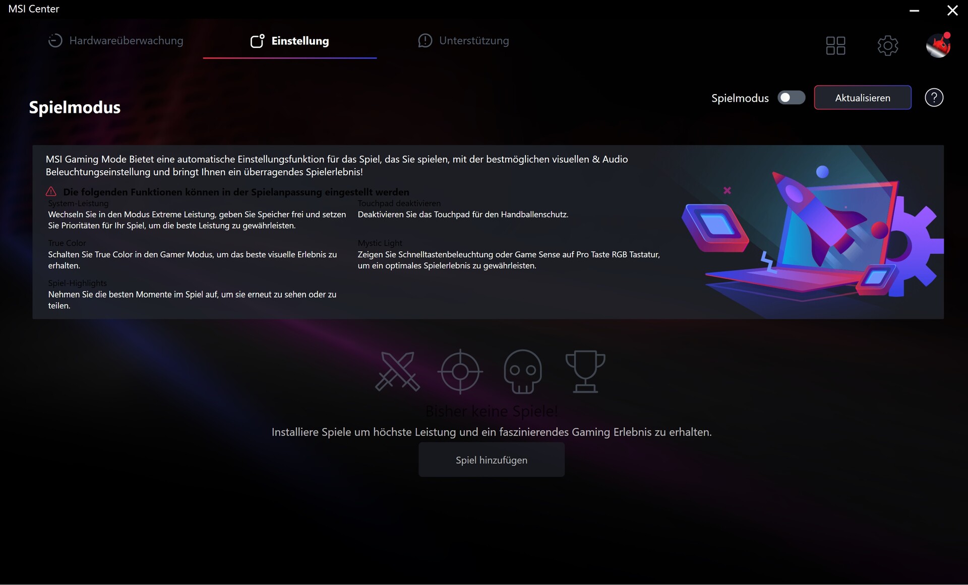 Im vorinstallierten MSI Center kann man aus mehreren Betriebsmodi wählen. Diese reichen von Eco bis hin zu Sport. All unsere Messungen wurden im Modus Smart Auto durchgeführt, bei dem das System selbstständig auf die derzeit passenden Einstellungen wechselt. Hinzu kam die standardmäßig aktivierte Grafikumschaltung (MSHybrid).