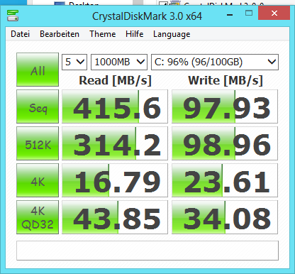 Die SSD (Typ Kingston SMSM150S3128G) mit einer Bruttokapazität von 128 GByte ist als mSATA-Modul gesteckt. Sie liefert überraschend gute Werte, selbst im Vergleich zur High-End-SSD des Vaio Tap 11. Hier können das Transformer Book und das IdeaTab Miix 10 einmal nicht mithalten. Auffällig sind die hohen Raten beim Sequential Read, aber auch beim Read/Write 4K. Dies honoriert der PCMark 7 mit einem starken System Storage Score (Vaio Tap 11 nur 6 % besser). Einen echten Nutzen bringt das alles dem Nutzer aber nicht, wie unsere gefühlte Performance-Erfahrung und die System-Benchmarks zeigen.