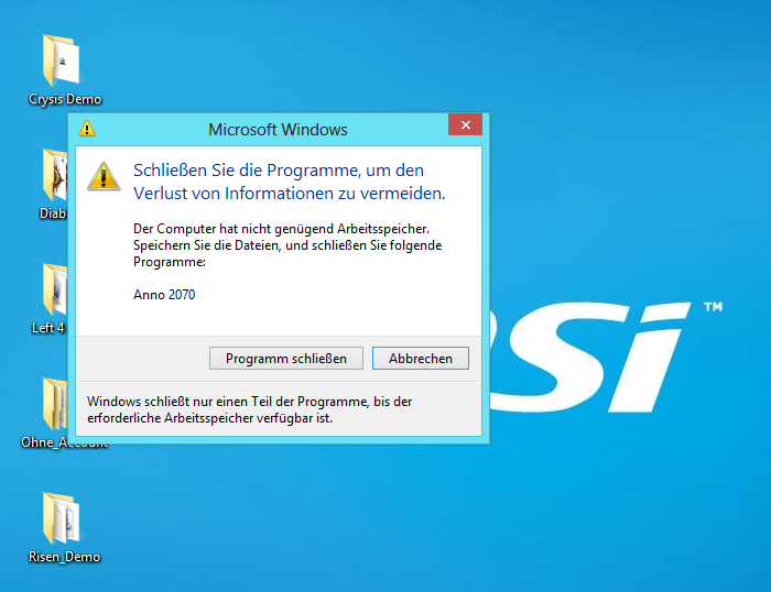 Im Falle des W20 nahmen Programmstarts jedoch bis zu 60 Sekunden in Anspruch (PCMark 8), so manches lief gar nicht (3DMark 11, Anno 2070, Crysis 1) oder starb den langsamen Tod eines fortwährend schwarzen Bildschirms (Diablo 3). Hinzu kamen während der Testphase häufige Speicherfehler (siehe Screenhot, bei 3DMark 2013) und zwei schwere Grafikfehler-Abstürze (während 3DMark) mit Neustart.