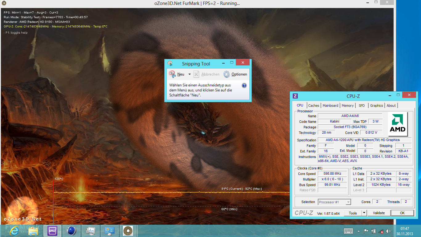Die niedrige Abwärme leistet eine APU, die wie bei den Einzel-Benchmarks nicht mit 1.000 sondern nur mit 600 MHz arbeitet. Das macht sie konstant, auch noch nach einstündigem Stresstest bzw. wenn Prime 95 (Multi) solo ausgeführt wird. Die GPU-Taktung konnten wir wie gehabt nicht auslesen.