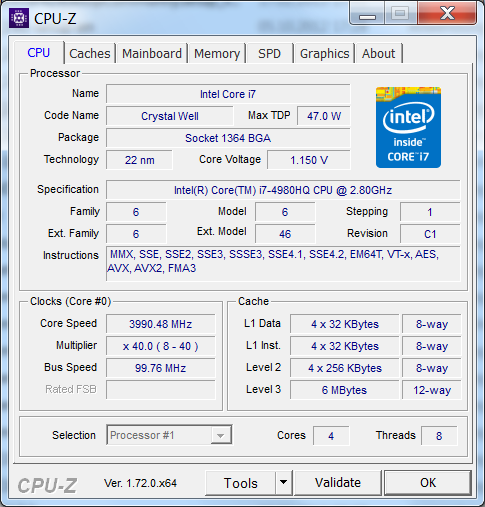 Im MSI WT72 kommt derzeit immer Intels Core i7-4980HQ zum Einsatz. Hierbei handelt es sich um eine der nominal leistungsstärksten Haswell-CPUs, die man derzeit bekommen kann. Eine Umstellung auf Intels Broadwell hat MSI bei der Workstation WT72 wahrscheinlich aufgrund der schlechten Verfügbarkeit und der bald schon wieder anstehenden Skylake-Generation ausgelassen. Doch auch die hier verwendete Haswell-CPU gehört sicherlich noch nicht zum alten Eisen und liefert durchaus respektable Eckdaten. Bei einer noch moderaten Thermal Design Power von 47 Watt können bis zu 8 Threads gleichzeitig bearbeitet und Taktraten von bis zu 4 GHz (bei Single-Thread-Aufgaben) erreicht werden. Das sorgt für eine immer optimale Leistungsentfaltung je nachdem welche Arbeitsweise die jeweilige Software unterstützt.