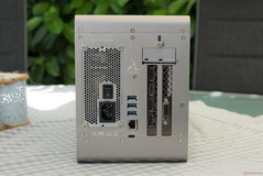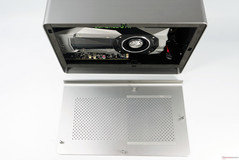 Wie bereits in den Quick Facts aufgezählt, bietet die Mantiz MZ-02 nicht nur Platz für eine PCIe-Karte, sondern auch für einige zusätzliche Ports. 5x USB 3.0 außen, Gigabit-LAN und auch ein interner SATA-Anschluss. Dieser wird jedoch (so wie der LAN-Port) nur per USB angeschlossen, um Bandbreite zu sparen. Hier muss sich jeder Hersteller entscheiden: Bietet man schnelle Anschlüsse und Features auf Kosten der GPU-Leistung, verzichtet man komplett darauf oder nutzt man eine sparsame USB-3.0-Verbindung zum Anschluss. Die Mantiz Venus ersetzt daher nur eingeschränkt ein Thunderbolt Dock (wie das Mantiz Titan, Test folgt) und bietet dafür eine relativ hohe Leistung für eine externe Grafikkarte. Laut Mantiz kommt auch die "Intel dynamic Firmware" zum Einsatz, welche Bandbreite zu USB, LAN und SATA nur zuweist, wenn diese auch genutzt werden. Was wir vermissen, ist ein zusätzlicher Thunderbolt-Ausgang, um z.B. schnell per Daisy Chain ein weiteres USB-C- oder Thunderbolt-Gerät anzuschließen. Dies könnte jedoch auch an der Bandbreite knabbern, bei vielen Notebooks hat man aber nur einen Thunderbolt-Port und ist dadurch dann etwas limitiert. Ein weiterer Kritikpunkt ist das relativ kurz bemessene Thunderbolt-Kabel (0,5 m). Dadurch ist man bei der Positionierung der Box deutlich eingeschränkt. Gerade durch die hörbaren Lüfter wäre die Aufstellung unterhalb eines Tisches bevorzugenswert. Aber auch hier gibt es driftige Gründe für das kurze Kabel. Mit hoher Bandbreite werden lange Kabel problematisch und vor allem unglaublich teuer.