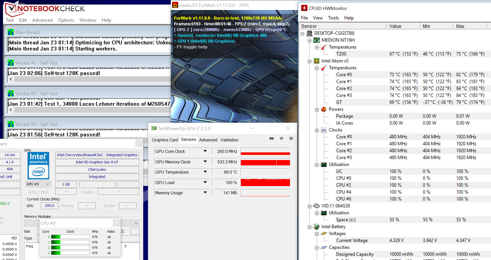 Unseren Stresstest (Prime95 und Furmark laufen für mindestens eine Stunde) durchläuft das Akoya im Netz- und im Akkubetrieb auf die gleiche Weise. Die CPU geht immer mit 480 MHz zu Werke. Der Grafikkern arbeitet zu Beginn des Tests mit 400 MHz, im späteren Verlauf wird er auf 200 MHz gedrosselt.