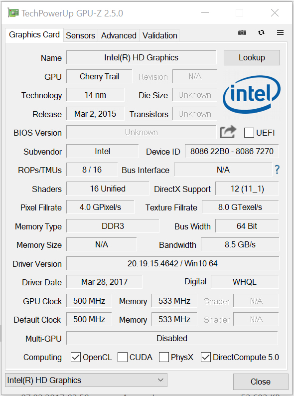 Der HD Graphics (Cherry Trail) Grafikkern unterstützt DirectX 12 und arbeitet mit Geschwindigkeiten von bis zu 500 MHz. Die Resultate in den 3D-Mark-Benchmarks bewegen sich auf einem normalen Niveau für diese GPU. Der in die GPU integrierte Decoder kann den Prozessor bei der Wiedergabe von H.264- und HEVC/H.265-Material entlasten.