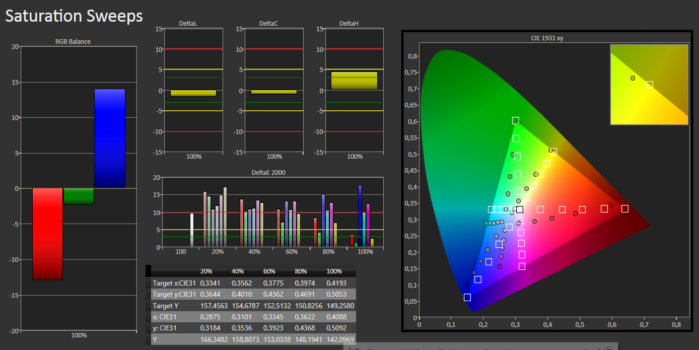 Die folgenden Screens zeigen die Farbanalyse mit dem i1 Pro 2 Fotospektrometer vor der Kalibrierung. Hier wird eine deutliche Schwäche bei der Darstellung von Grautönen erkennbar: DeltaE(2000) von 15 und mehr. Auffällig: Mit 11.400 K ist der Weißpunkt sehr stark in den kühlen Bereich verlagert. Eine gute Farbgenauigkeit im Rahmen einer nicht vorhandenen sRGB-Abdeckung ist nur bei Grün, Rot und Gelb gegeben. Cyan und Magenta rutschen stark ins Blaue ab, was für einen starken, auch deutlich sichtbaren Blaustich sorgt (DeltaE: 10-17).