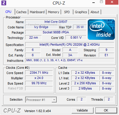 Der eingesetzte Prozessor Intel Pentium 2020M basiert auf der aktuellen Ivy-Bridge-Architektur und wurde in 22-nm-Strukturbreite gefertigt, wobei jedoch viele Features deaktiviert sind. Dadurch können mit dem Dual-Core-Prozessor auch nur zwei Threads bearbeitet werden. Der Kerntakt liegt bei 2,4 GHz, wobei die Taktzahl im Leerlauf gedrosselt wird, um Energie zu sparen.