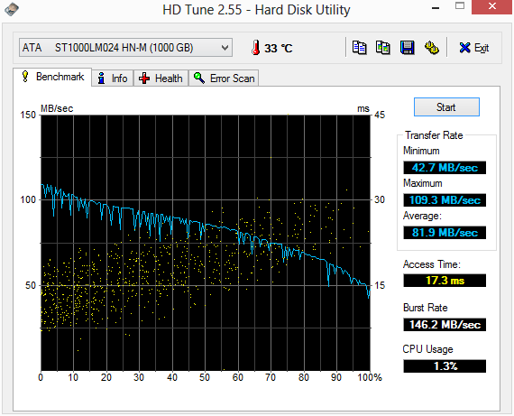 Der Massenspeicher im Akoya E7221 ist sehr großzügig bemessen: 1 TB umfasst die Festplatte von Seagate. Sie hört auf den langen Namen Momentus SpinPoint M8 ST1000LM024 HN-M101MBB und dreht mit 5.400 U/min. Dadurch ist sie etwas langsamer als ihre Konkurrenten mit 7.200 U/min, allerdings auch ein bisschen leiser. Trotzdem kann sich die durchschnittliche Übertragungsrate von 81,9 MB/s sehen lassen. Die Zugriffszeit von 17,3 ms liegt im Mittelfeld. Hier könnte die Leistung des ganzen Systems durch eine kleine SSD, die in den zweiten, freien Festplattenschacht eingebaut werden kann, deutlich beschleunigt werden.