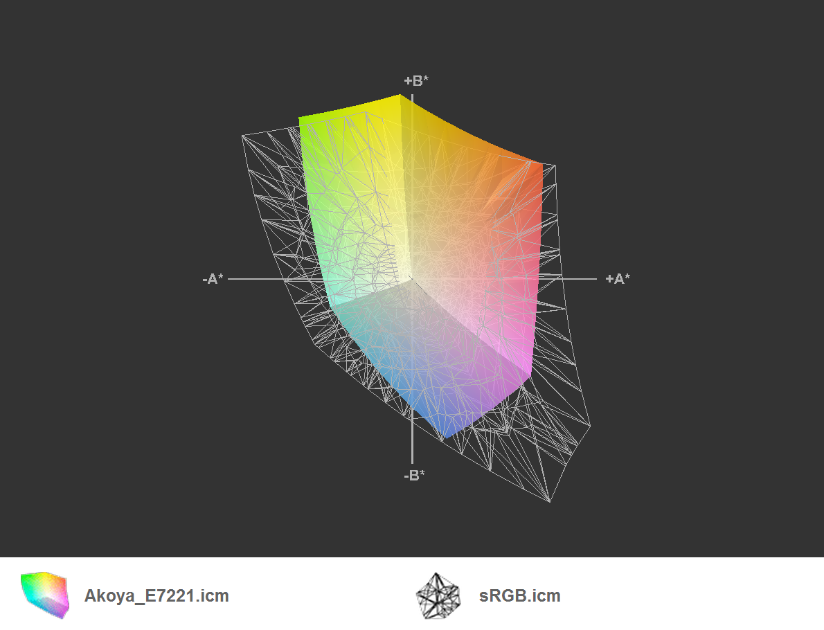 Es werden weder der sRGB-Farbraum, noch der anspruchsvollere AdobeRGB-Farbraum annähernd erreicht. In dieser Preisklasse war das aber auch nicht zu erwarten und sollte die meisten Nutzer nicht stören.