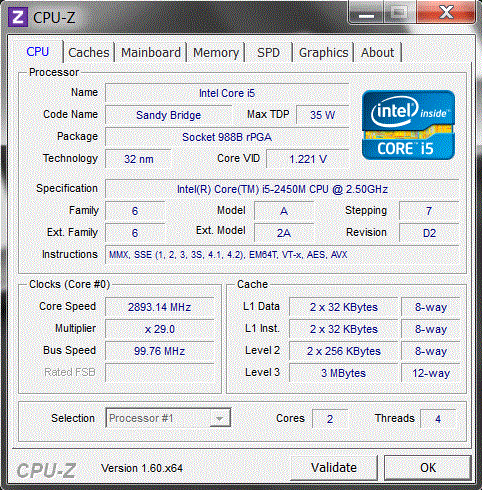 Wichtigstes Feature ist wohl die automatische Übertaktung. Mithilfe der Turbo-Boost-Funktion wird der Takt von standardmäßig 2.5 auf maximal 3.1 GHz erhöht (je nach Auslastung und Temperatur). Ein weiteres Merkmal ist die Hyper-Threading-Technik, welche den beiden realen Kernen zwei virtuelle Pendants zur Seite stellt. Folge: Der Core i5-2450M packt bis zu vier parallele Threads.