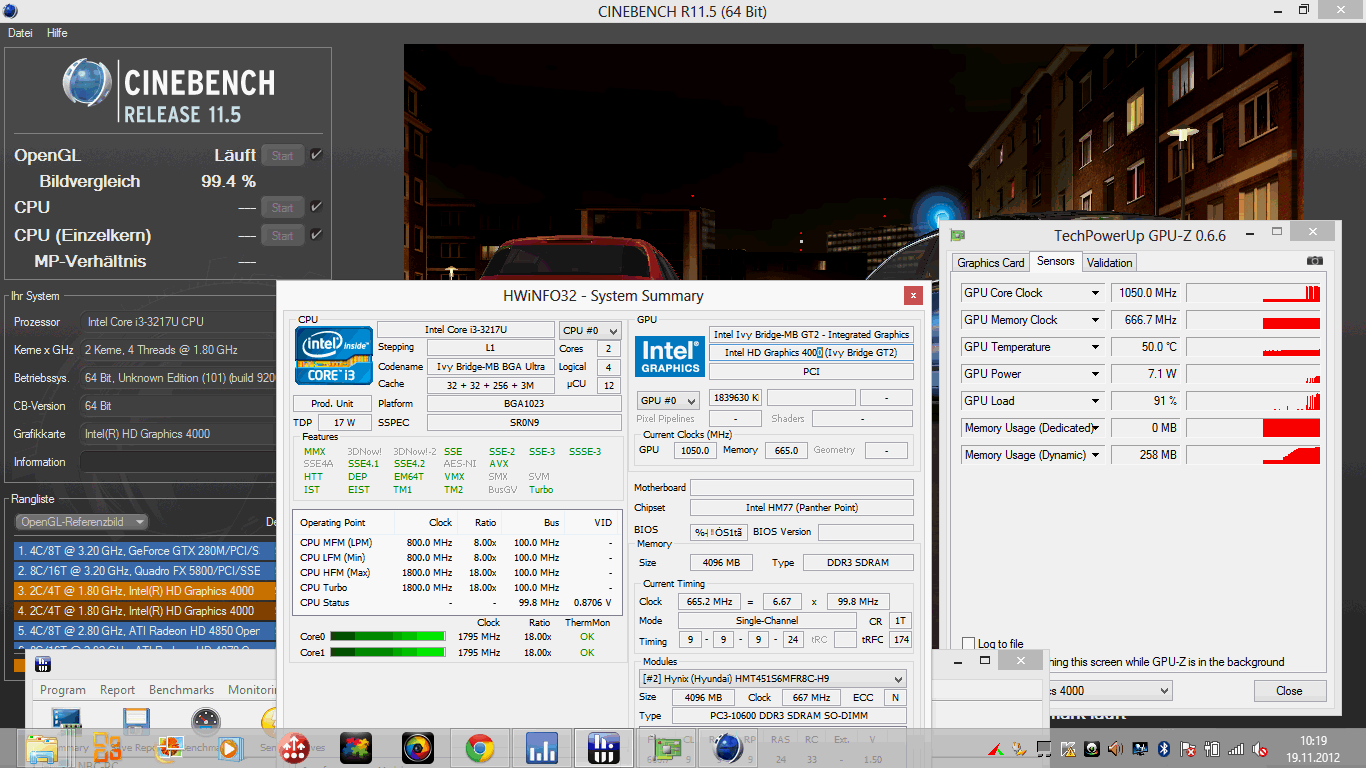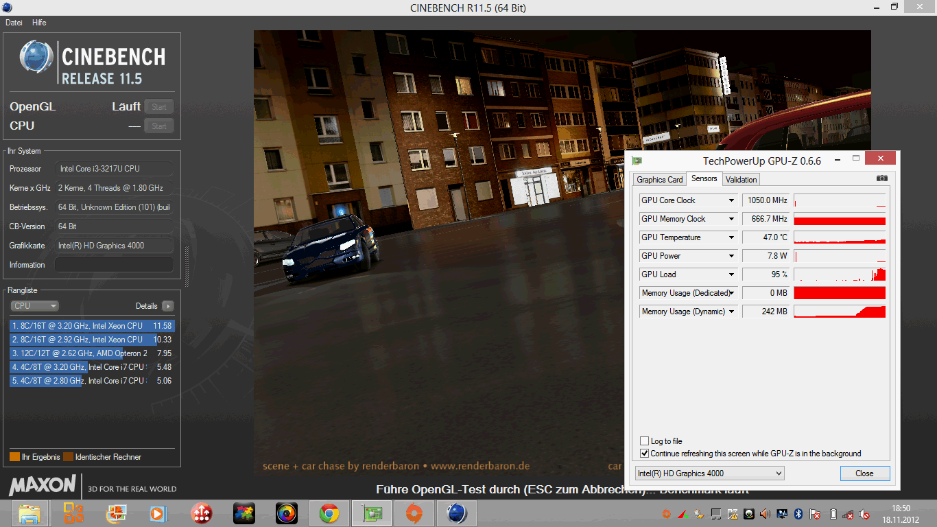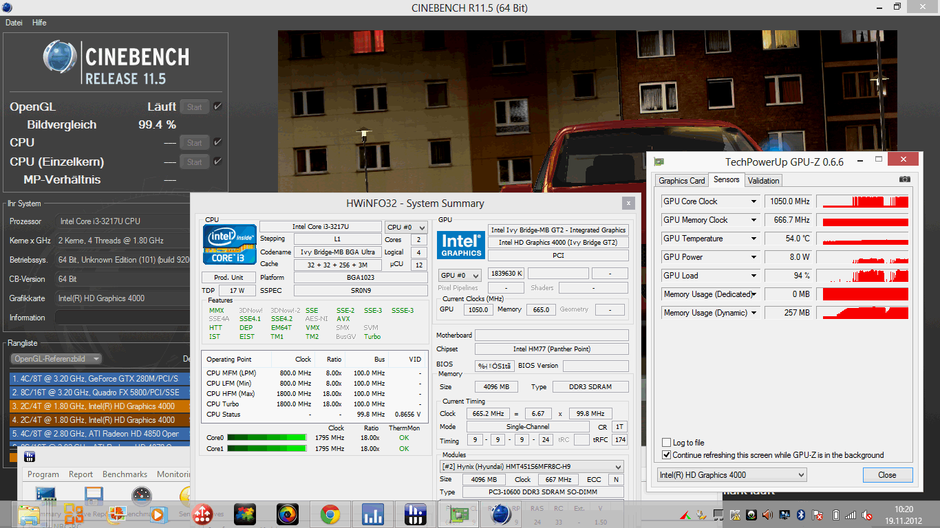 Im Akkubetrieb müssen wir nicht auf die CPU-Leistung verzichten. Der R11.5-Multi-Test endet ident auf 1,76 Punkte. Gleiches gilt für den OpenGL-Test der integrierten HD 4000 Grafik. Die Intel GPU rendert jederzeit mit einem Kern-Takt von 1.050 MHz und fällt im Leerlauf auf 350 MHz zurück.