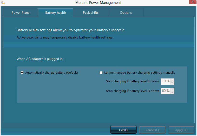 Die Leerlauf-Laufzeit ist eher theoretischer Natur, erlaubt aber den Ausblick auf das maximal Mögliche. Der Readers Test des Battery-Eater setzt erst nach 9:04 Stunden (544 Min.) aus. Im WLAN-Test (Skript ruft Websites auf, teilweise mit Videos) ermitteln wir eine Laufzeit von 5:30 Stunden (330 Min.). Die Helligkeit während des Tests war auf zirka 150 cd/m² gesetzt (zwei Stufen dimmen). Im Generic Power Management können die Ladevorgänge manuell begrenzt werden, was der Lebensdauer der Zellen dient (z. B. 80 %).