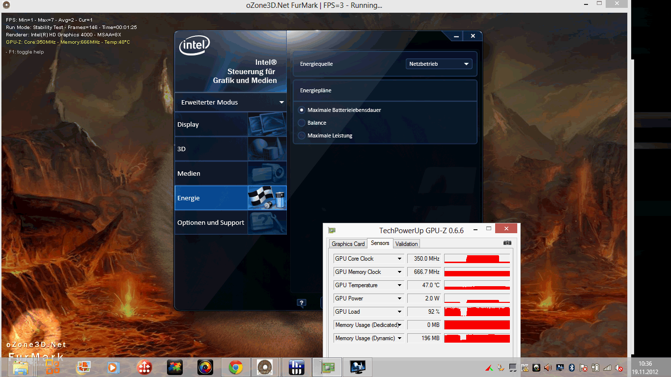 Sofern die Intel-Grafiksettings nicht dazu zwingen (Power-Mode "maximale Batterielebensdauer"), kann die HD 4000 volle 1.050 MHz fahren (Furmark Solo). Dies gilt aber nur, wenn nicht zeitgleich CPU-Rechenleistung abverlangt wird (Prime95). In diesem Fall agiert der Core i3 mit seinen vollen 1,8 GHz, erlaubt seiner HD 4000 aber nur die 350 MHz Sparflamme. Dies kann der Hintergrund des relativ niedrigen 3DMark 06 Scores sein.