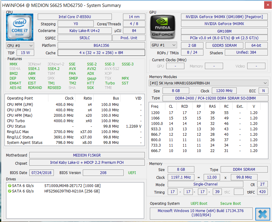 Medion stattet das Akoya mit einem Intel Core i7-8550U (Kaby Lake Refresh) Vierkernprozessor aus. Hierbei handelt es sich um ein ULV-Modell (TDP: 15 Watt), das genügend Rechenleistung für alle gängigen Anwendungsbereiche bereitstellt. Die CPU arbeitet mit einer Basisgeschwindigkeit von 1,8 GHz. Mittels Turbo ist eine Steigerung auf bis zu 4 GHz möglich.