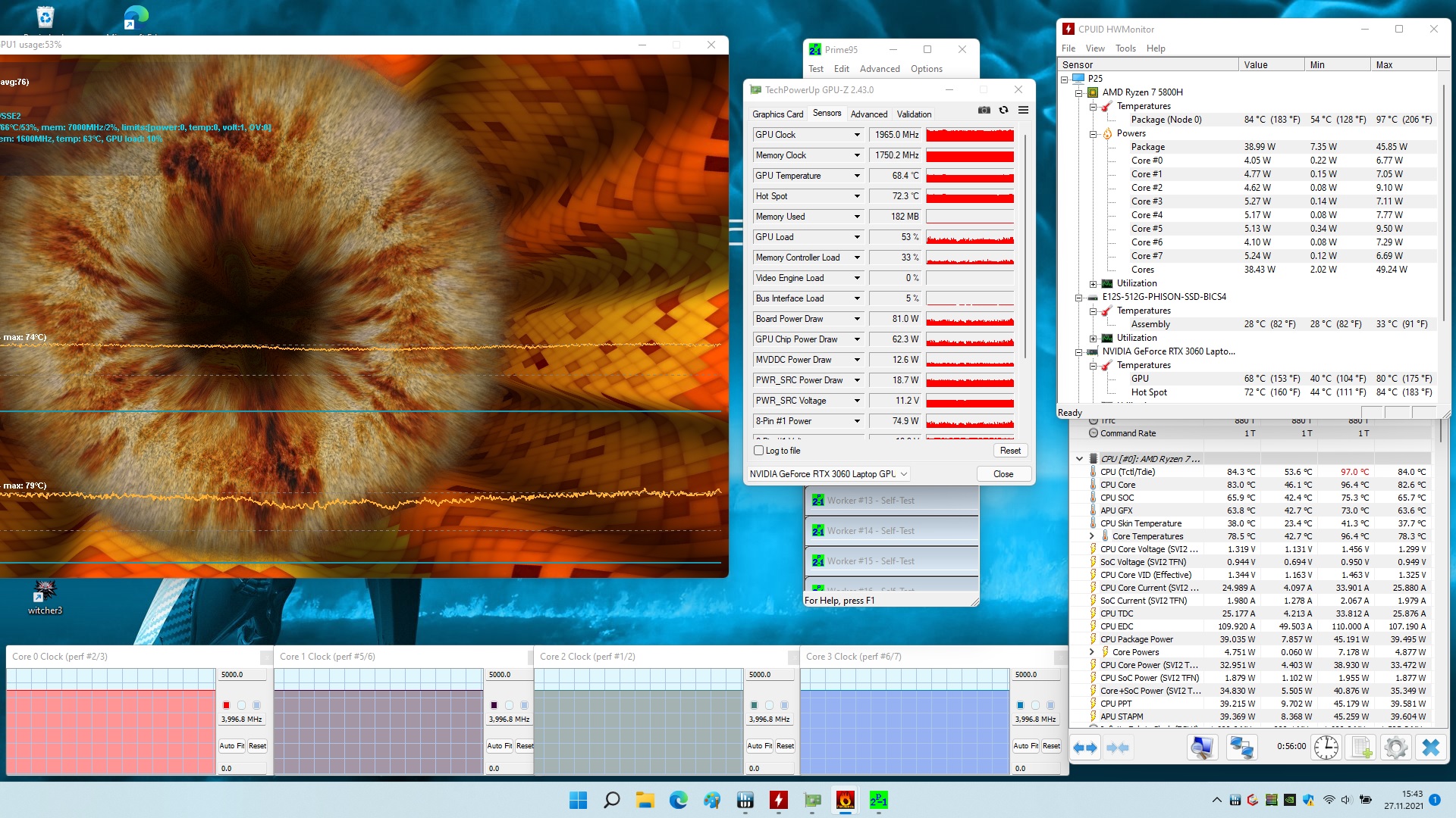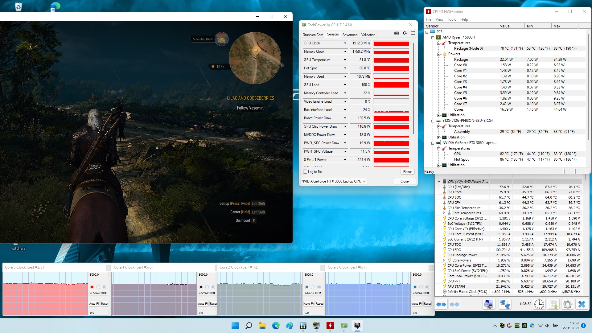 Die Komponenten sterben ebenfalls keinen Hitzetod. Egal, ob Stresstest oder The Witcher 3: Die 90°C-Marke wird im Schnitt nicht geknackt (siehe Bilder).