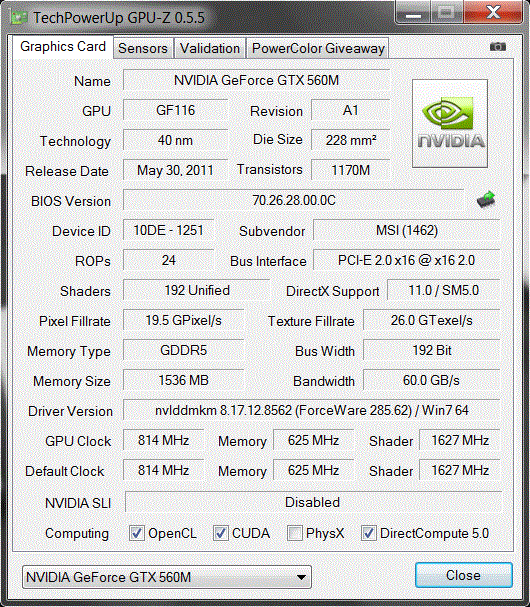 Wie der Prozessor gehört auch die Grafikkarte dem High-End-Segment an. Nvidias GeForce GTX 560M ist ein topaktueller DirectX-11-Beschleuniger, der auf der Fermi-Architektur (GF116-Chip) basiert und sich mit 192 Shadereinheiten (1550 MHz), 1170 Millionen Transistoren und einem 1536 MByte großen GDDR5-Videospeicher (1250 MHz, 192-Bit-Interface) rühmen kann. Ein Kerntakt von 775 MHz entspricht ebenfalls den Vorgaben.