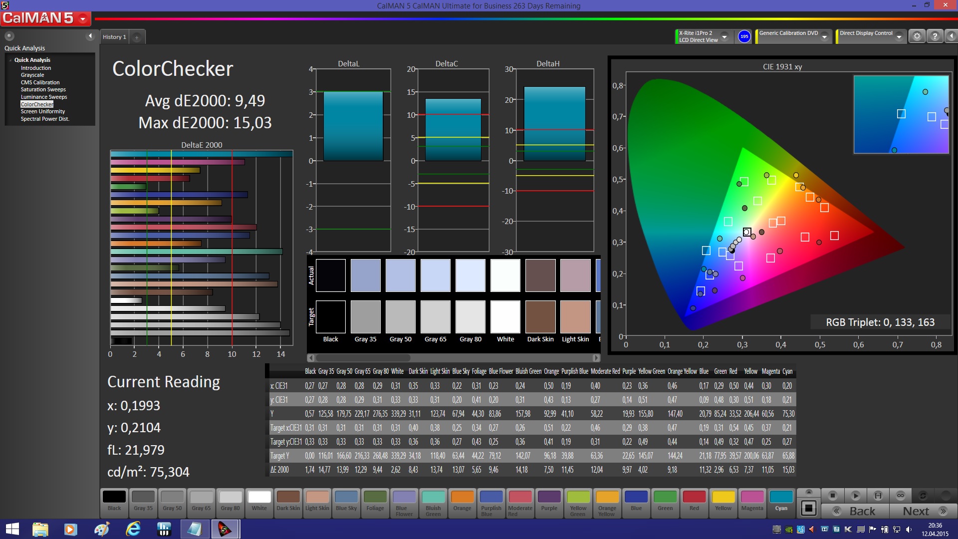 Die gute Nachricht ist, dass eine Kalibrierung der Bilddarstellung auf dem Monitor ziemlich stark zugutekommt. Das zeigen unter anderem unsere Messergebnisse aus der Software CalMan, die wir mithilfe eines Spektralfotometers gewonnen haben. Allerdings ist diese Kalibrierung auch dringend zu empfehlen, sonst zeigt sich auf dem Bildschirm doch ein sehr krasser Blaustich und so gut wie alle Farbwerte weichen extrem vom Optimalwert des Farbraums sRGB ab. Nach der Kalibrierung zeigt sich ein völlig anderes Bild: Nur noch Gelb- und Orangetöne weichen etwas zu stark ab, die Grautöne sind fast perfekt und auch die Farbtemperatur entspricht beinahe dem Optimum von 6.500 Kelvin.