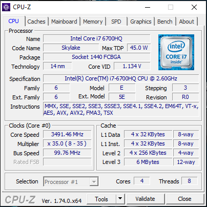 Befeuert wird das Erazer von einem Core i7-6700HQ aus Intels Skylake Generation. Es handelt sich dabei um einen herkömmlichen Mobilprozessor, der eine TDP von 45 Watt besitzt. Zu den ULV-CPUs zählt das Modell somit nicht. Seine Basisgeschwindigkeit liegt bei 2,6 GHz. Per Turbo kann der Takt auf 3,1 GHz (vier Kerne), 3,3 GHz (zwei Kerne) bzw. 3,5 GHz (ein Kern) gesteigert werden. Im Akkubetrieb arbeitet der Prozessor mit konstanten 1,6 GHz. Im Netzbetrieb wird der Turbo voll eingesetzt.