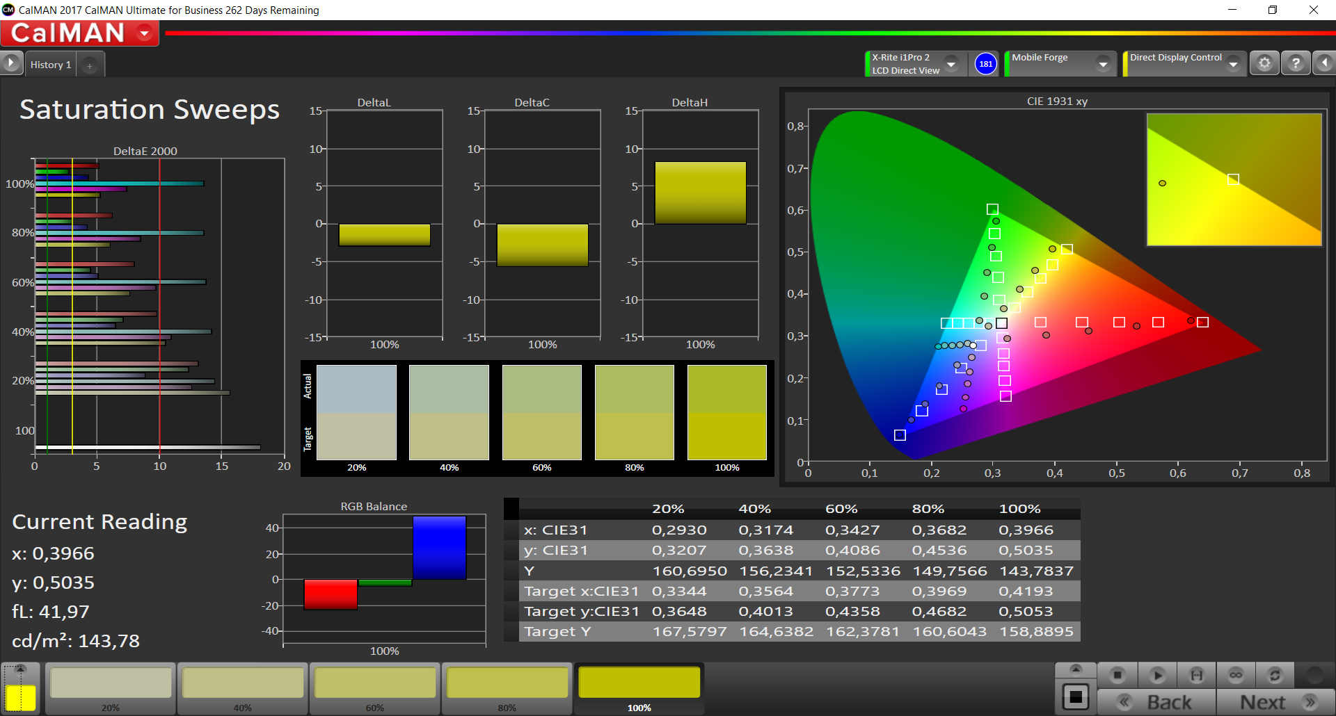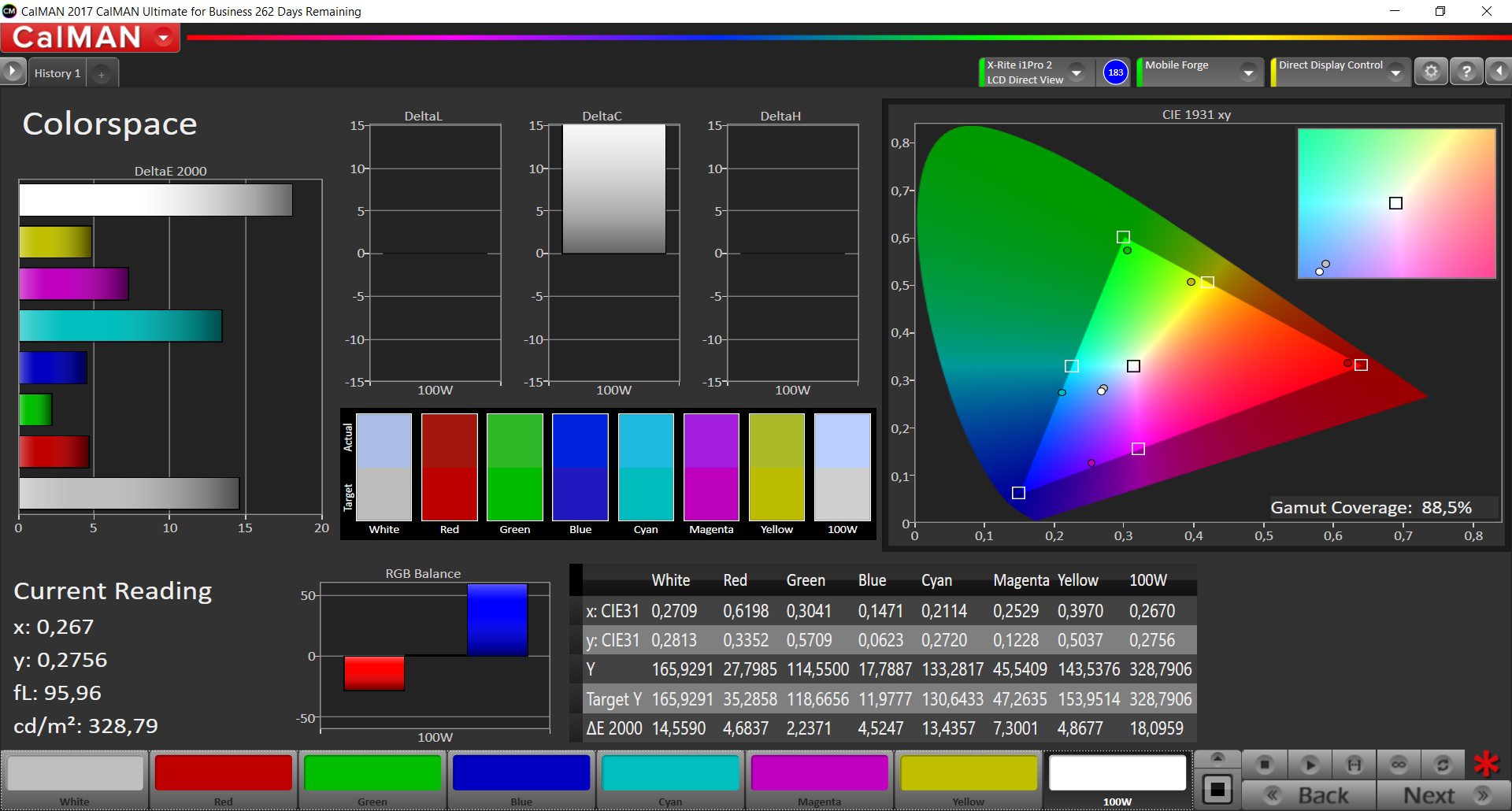 | Delta E Colorchecker * | 9.1 | 1.4 85% | 4.5 51% | 15 -65% | 5 45% | 4.2 54% |