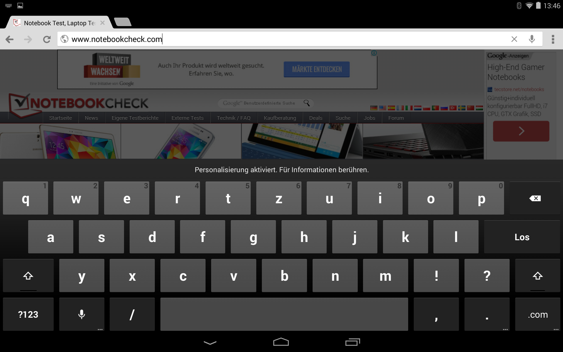 Die virtuelle Tastatur hält keine Überraschungen bereit – Android-Standard halt. Im Querformat verdeckt sie mehr als die Hälfte des Bildschirminhaltes, bietet im Gegenzug aber große Tasten für flüssiges Tippen. Im Hochformat hingegen wird es für "Wurstfinger" dann schon eng.