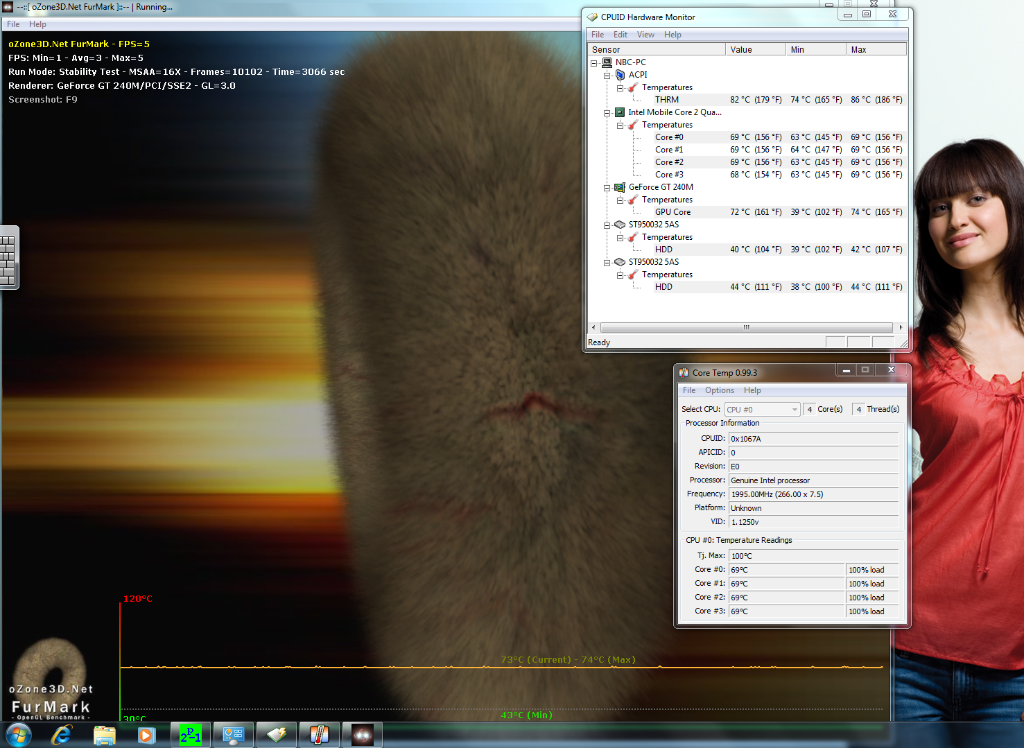 Die geringe Taktung des Q9000 von 2.0 GHz wirkt sich in den meisten Fällen negativ auf die Leistung in Spielen aus. Der Grund: Spiele mit Multi-Core-Unterstützung sind eher die Ausnahme. Hinzu kommt die Mittelklasse GPU Nvidia Geforce GT 240M, welche vergleichbar ist mit einer schnellen Mobility Radeon HD 4650 (DDR3 VRAM). Der 3DMark2006 endet mit 6.320 Punkten. Die GT240M im X9613 ist mit 1.024 MB DDR3 SD RAM bestückt und taktet mit 550 MHz im Kern, sowie 790 MHz im Speicher.