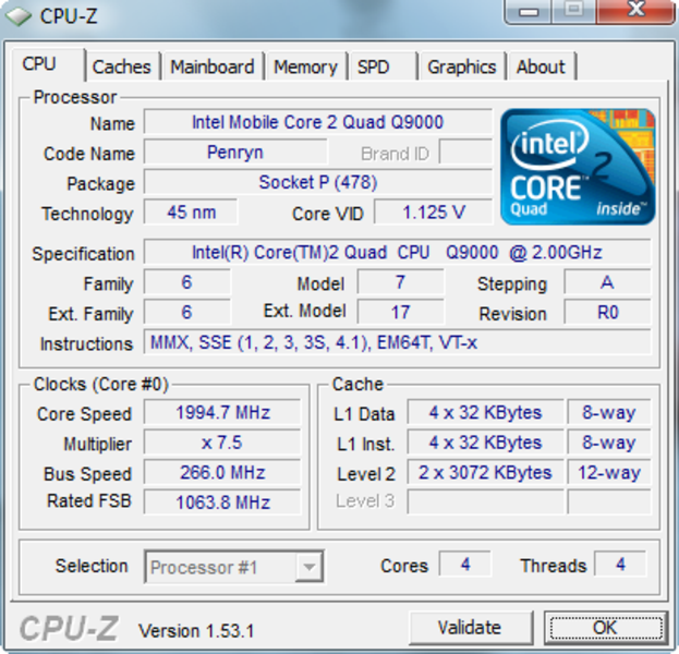Im Single-Core Benchmark Cinebench R10 Single-Rendering liegt der Q9000 gleichauf mit dem Core 2 Duo T6500 (2.1 GHz), wie er bis vor kurzem vielen preisgünstigen Notebooks verbaut wurde. Erst die Nutzung aller vier Kerne im Multi-Rendering desselben Benchmarks lässt den Q9000 fast so schnell sein wie ein Core 2 Xtreme X9100 (3.06 GHz).