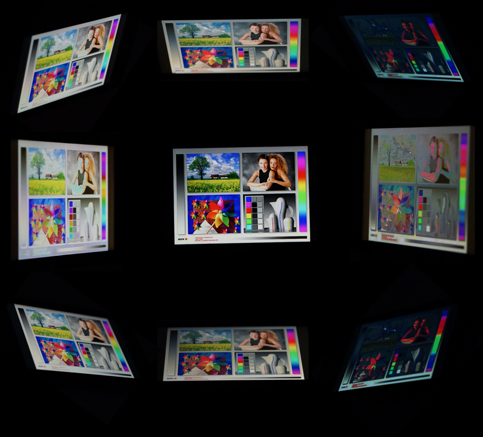Durch die TN-LED-Technologie sind die Blickwinkel des Bildschirms nicht sehr groß: Nach links und rechts kommt es zu Helligkeitsverlusten, hier ist die Sichtbarkeit aber noch in Ordnung. Nach oben und unten allerdings sind deutliche Farbverschiebungen sichtbar, und der Kontrast bricht zusammen, so dass man ab einem gewissen Punkt Details nicht mehr erkennen kann.