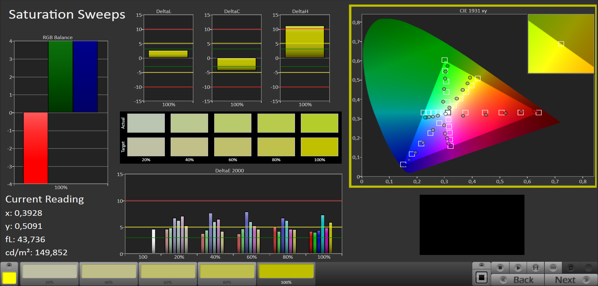 | Brightness (cd/m²) | 282 | 424 50% | 397 41% | 380 35% | 365 29% | 348 23% |