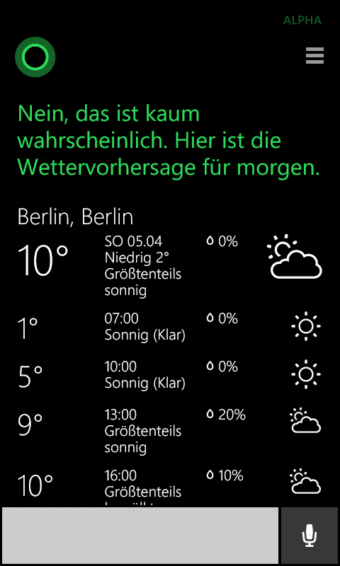 Die Tasten der virtuellen Tastatur scheinen auf den ersten Blick sehr klein, das Keyboard setzt aber Eingaben sehr genau um. Sie bietet Wortvorschläge und die Eingabe durch Wischengesten, allerdings noch keine Handschrifteneingabe oder ein Sprachdiktat direkt aus der Tastatur heraus. Die Alpha der Sprachassistentin Cortana ist ebenfalls wieder an Bord, leitet aktuell viele Anfragen allerdings einfach direkt an Bing weiter.