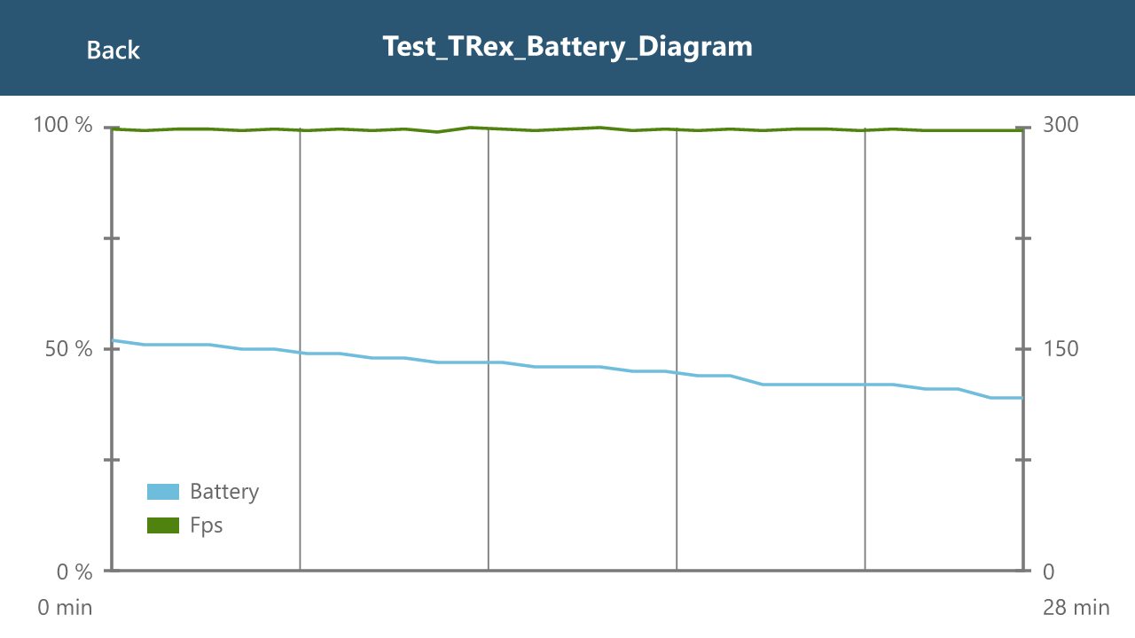 Der Akkutest im GFXBench, bei dem 30-mal dieselbe Benchmark-Sequenz wiederholt wird, zeigt, dass die Frame-Rate auch nach längerer Belastung stabil bleibt. Ein Drosseln der Leistungskomponenten ist also nicht zu erwarten.