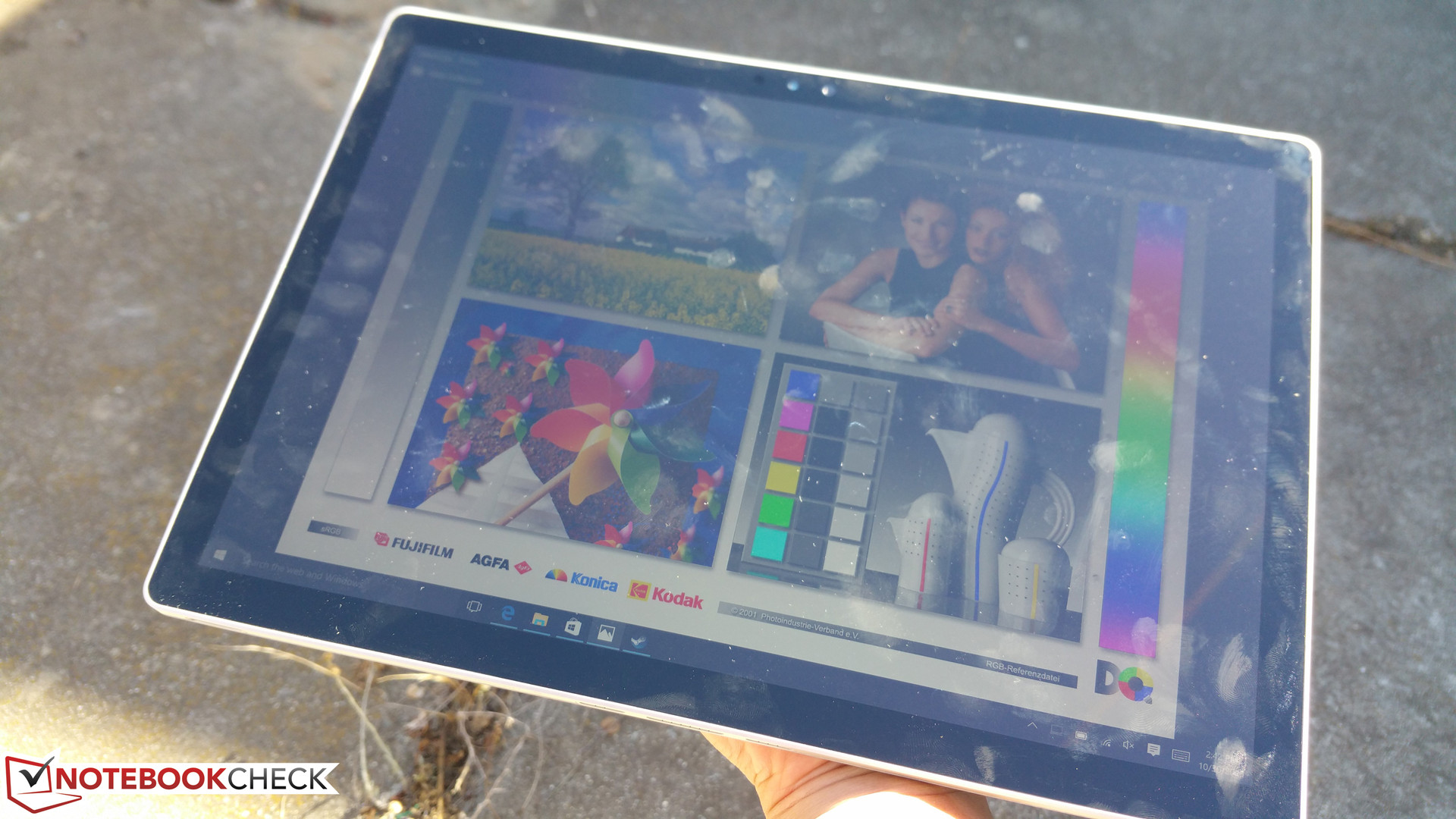 Die Outdoortauglichkeit ist im Schatten oder an einem bewölkten Tag sehr gut. Die maximale Helligkeit wird weder im Akkubetrieb noch im Solobetrieb ohne die Tastatur reduziert. Das spiegelnde Gorilla Glass 4 führt zwar zu Reflexionen, falls man diese aber vermeiden kann, lässt sich der Bildschirminhalt sogar im direkten Sonnenlicht ablesen.