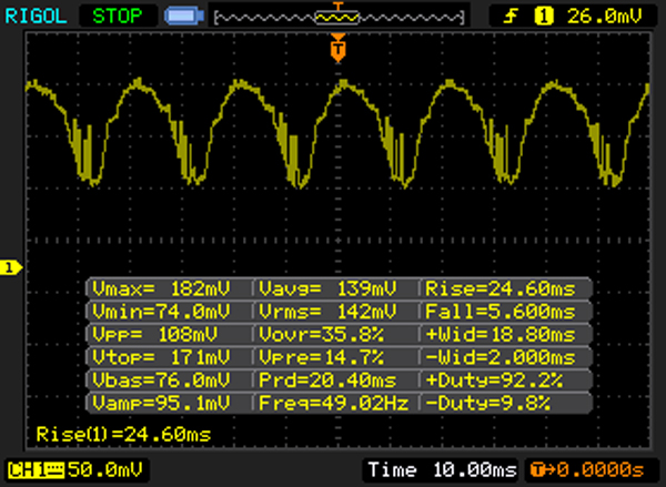 Dem schaden auch die unmerklichen Helligkeitsschwankungen nicht, welche unser Oszilloskop bemerkte. Die PWM- und Reaktionszeiten-Messungen haben wir daher ohne Netzteil ausgeführt.