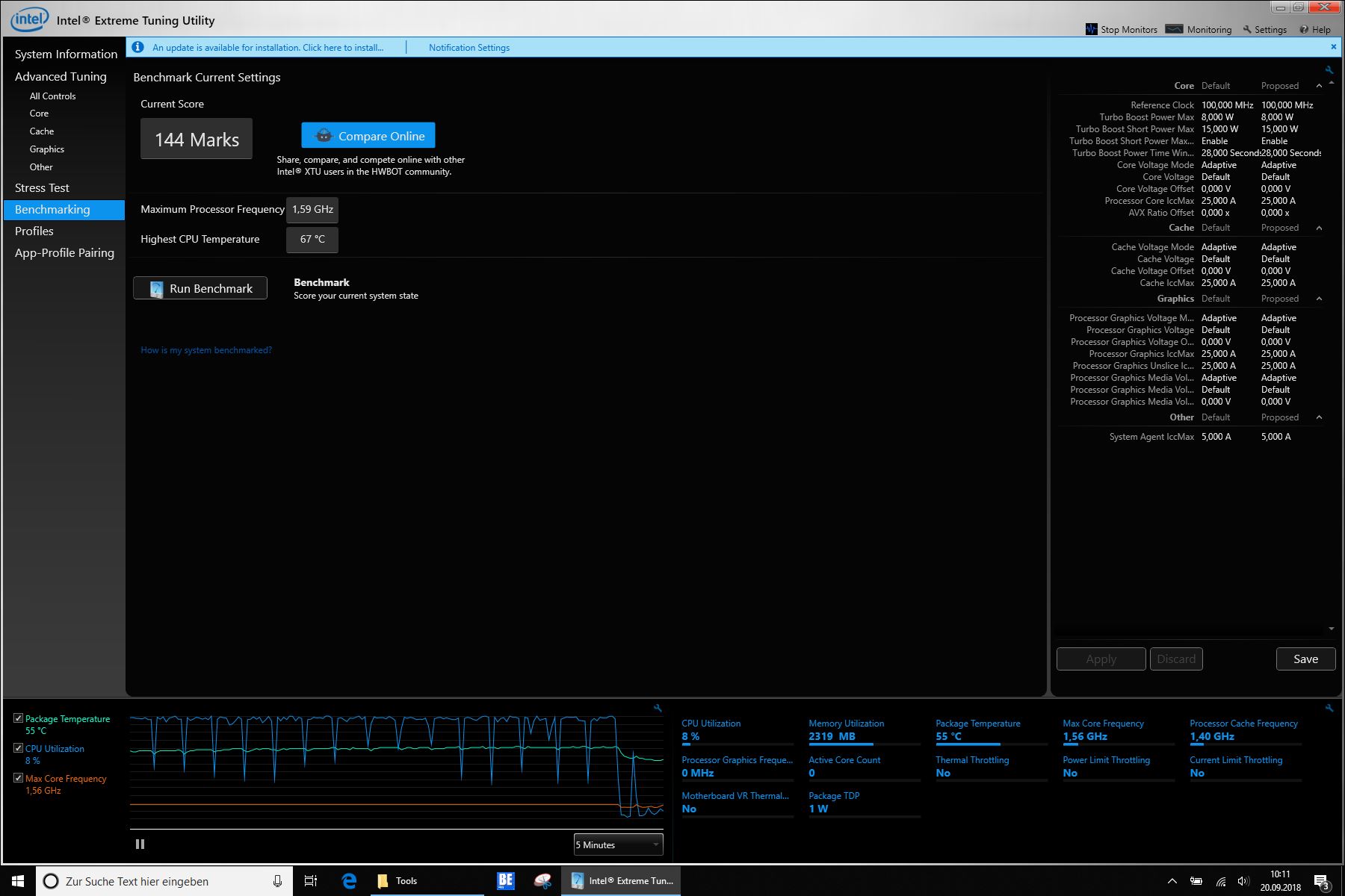 Auch im Akkubetrieb haben wir die Leistung von CPU und GPU geprüft und festgestellt, dass es hier keine gravierenden Leistungseinbußen gibt. Die Benchmark-Ergebnisse (3DMark 11 und Cinebench R15) liegen auch im Akkubetrieb auf fast dem gleichen Level.